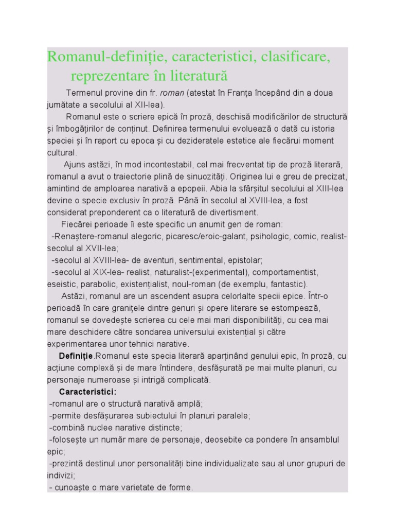 Proiectul este implementat de către primăria mun. Romanul este o specie a genului epic, in proza, de mari dimensiuni, cu mai multe fire narative si cu personaje numeroase. Romantismul se întoarce spre folclor și istorie (pot fi.